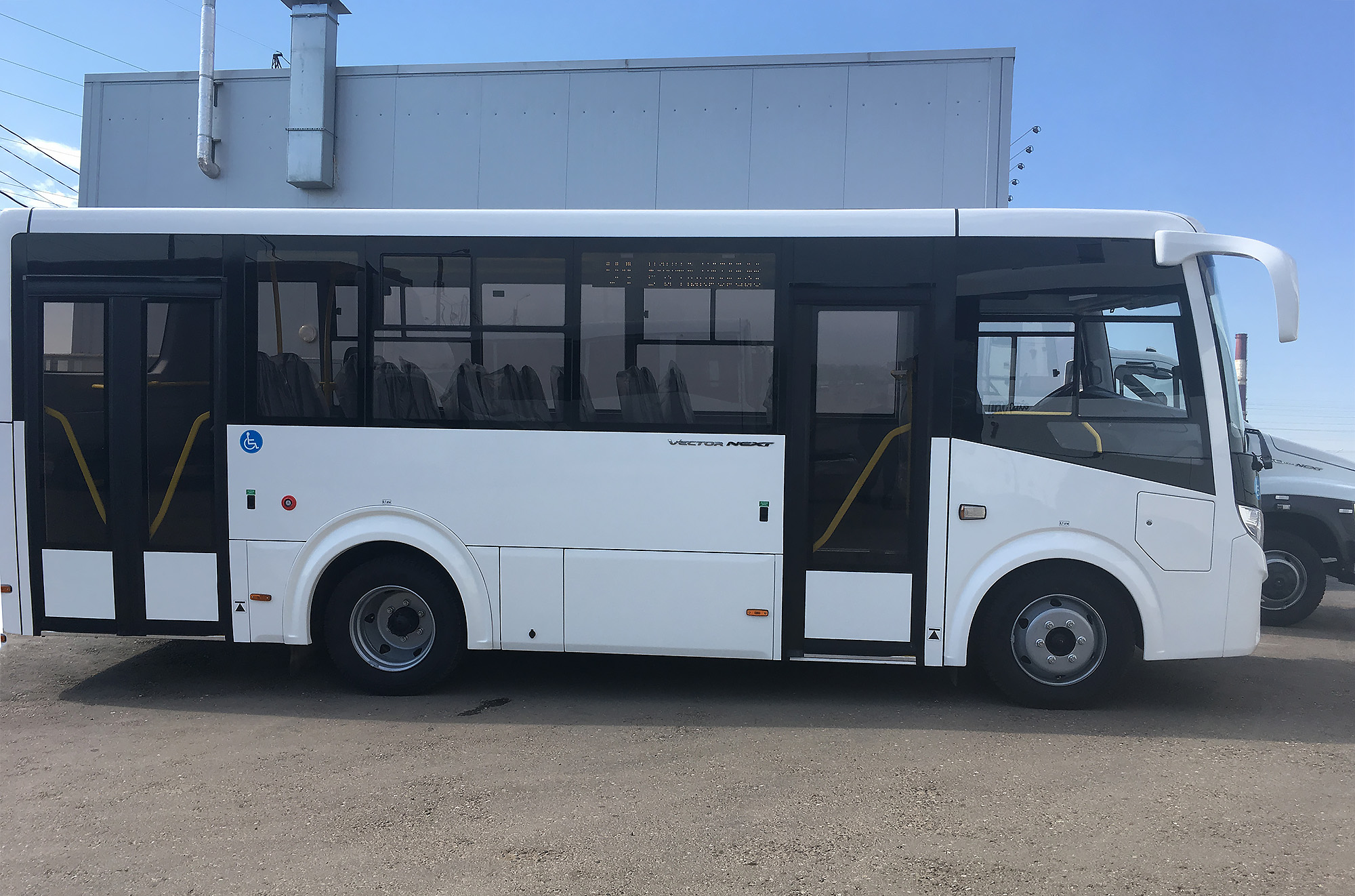 двухдверный городской автобус "Вектор Next "доступная среда" в новом кузове с дизельным двигателем ЯМЗ 53423 Е5, 19+1 мест, пассажировместимость 52. Низкопольная площадка в заднем свесе, механическая аппарель для заезда инвалидных колясок. Размеры 7645/2445/2965.Колес.фор. - 4x2; Пассаж-мость - 19+1/52; Модель двиг. - ЯМЗ-53423 SCR Евро-5; Мощн.дв. - 124,2 кВт; Тип КПП - механическая; Кол.ступ./диапазонов - 5-ти ступенчатая;