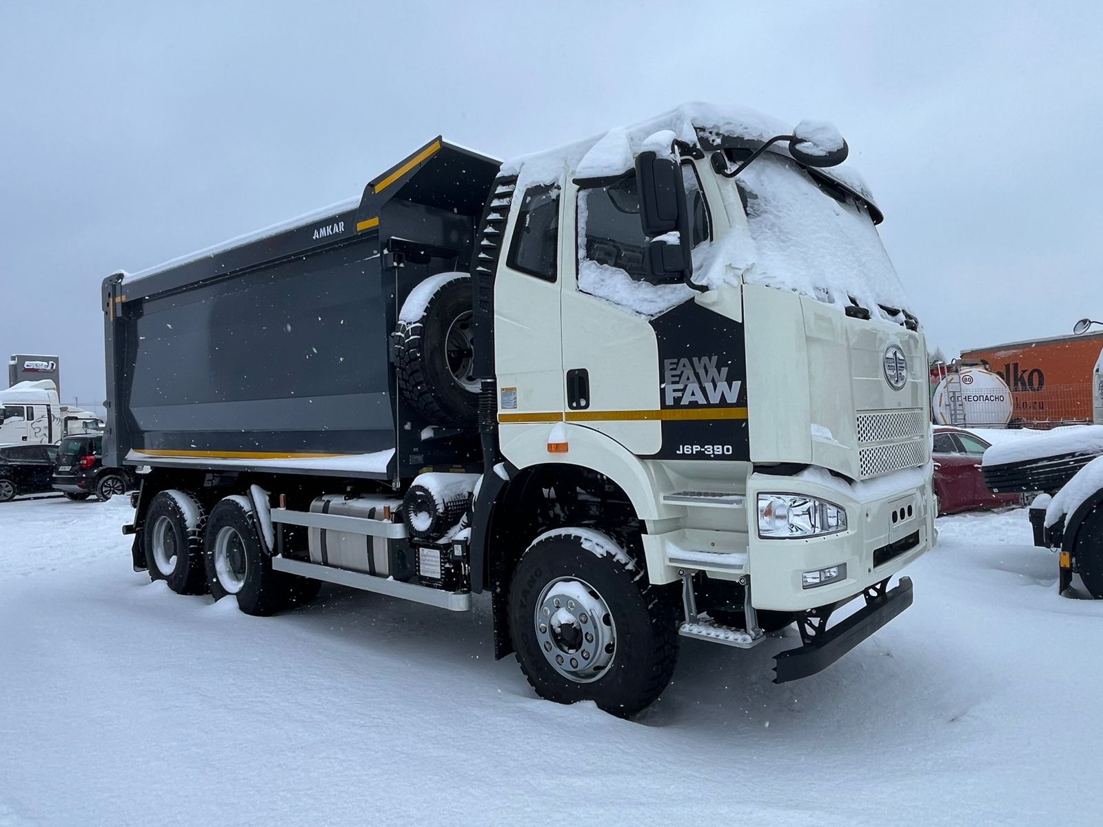 Самосвал FAW 3250, колесная формула 6х4, объем кузова 20 м3, двигатель 390 л.с., Евро 5 (мочевина), КПП -  Механическая, 12-ти ступенчатая, синхронизированная, с демультипликатором, шины 315/80 R 22.5, кабина с одним спальным местом, кондиционер, производитель кузова - АМКАР 20 м3. Тип - U-образный , Материал кузова Сталь 09Г2С/S500, Толщина настила пола 8 мм, Толщина панелей бортов 5 мм (Особые условия гарантии)